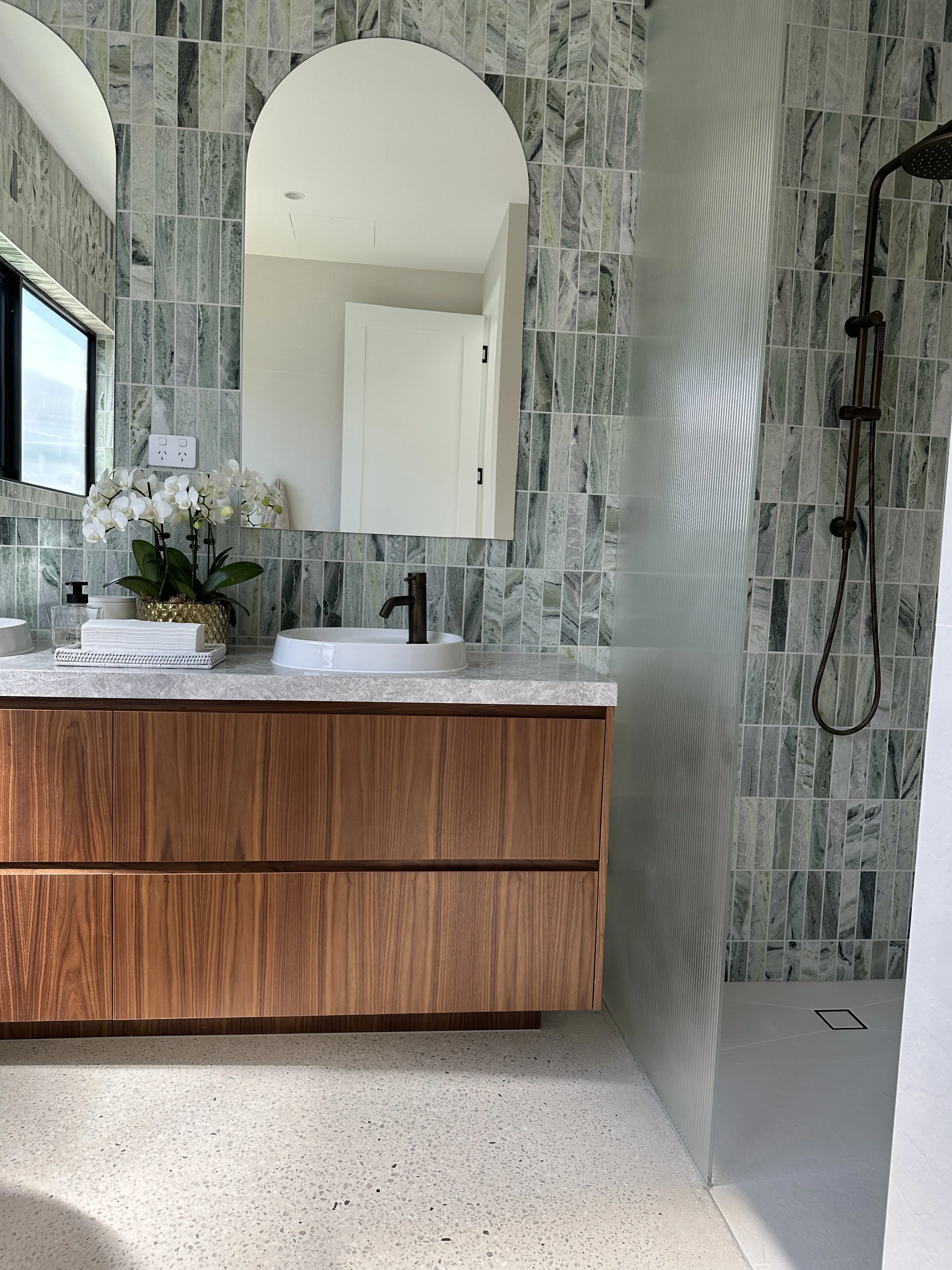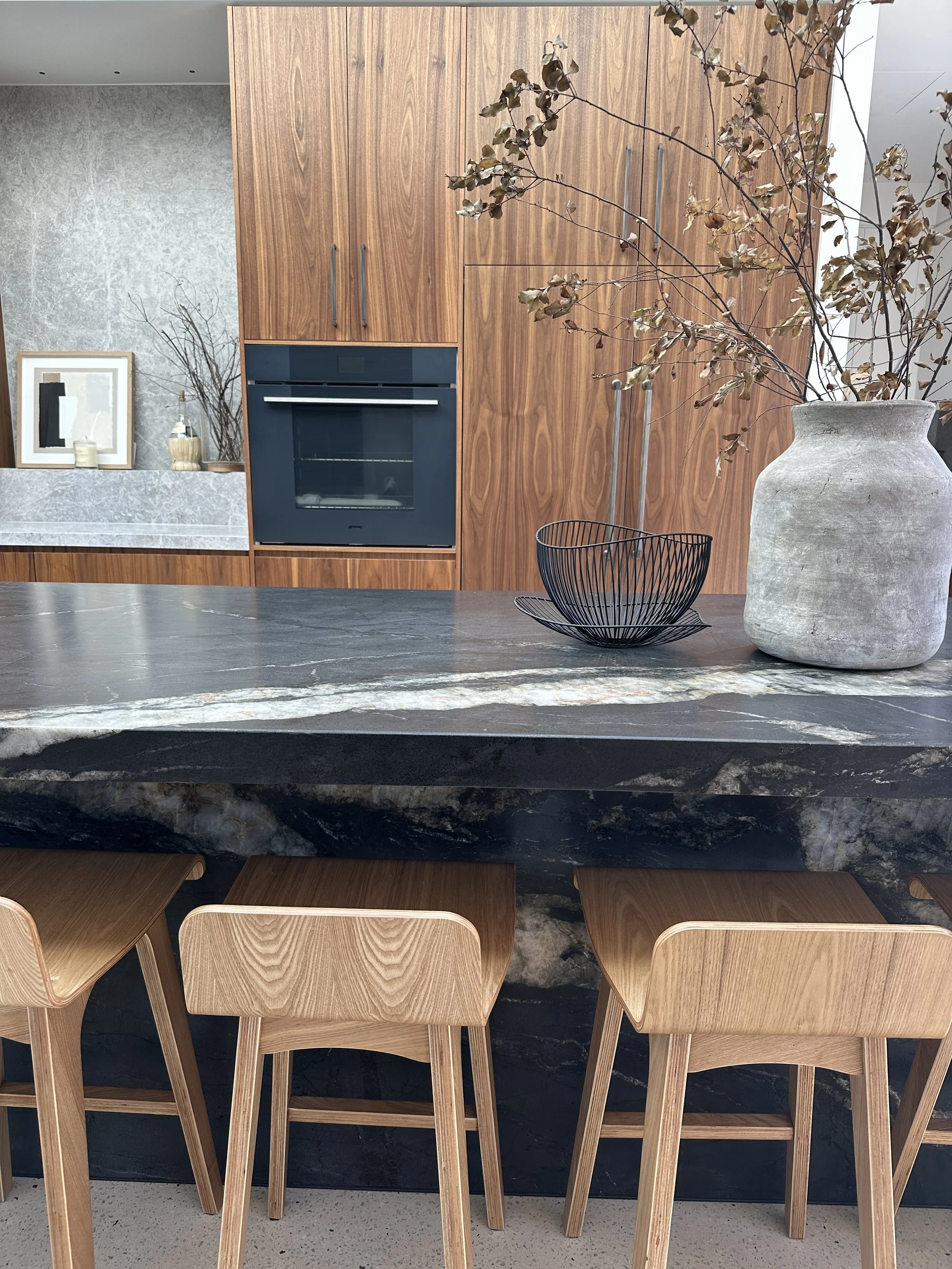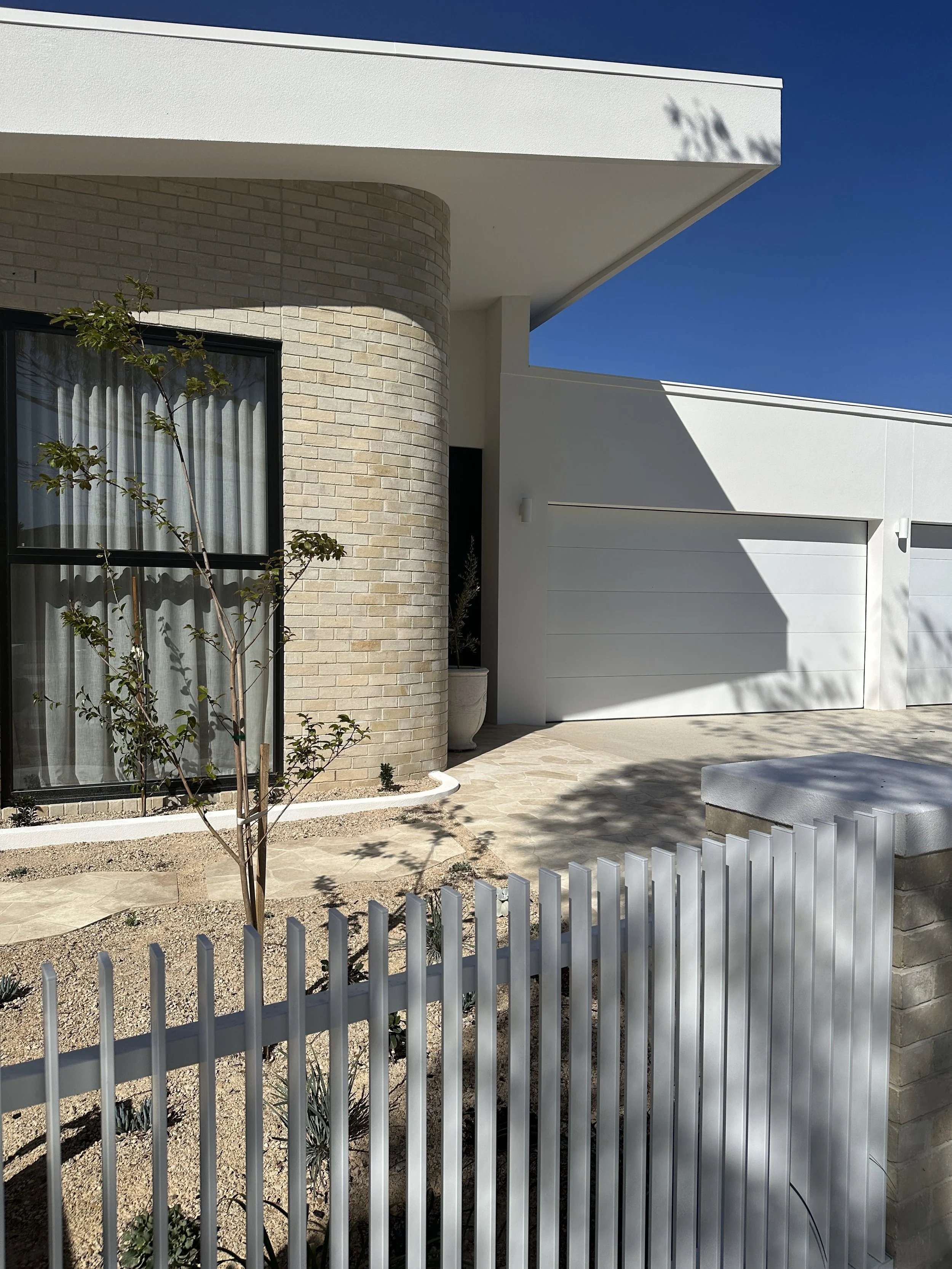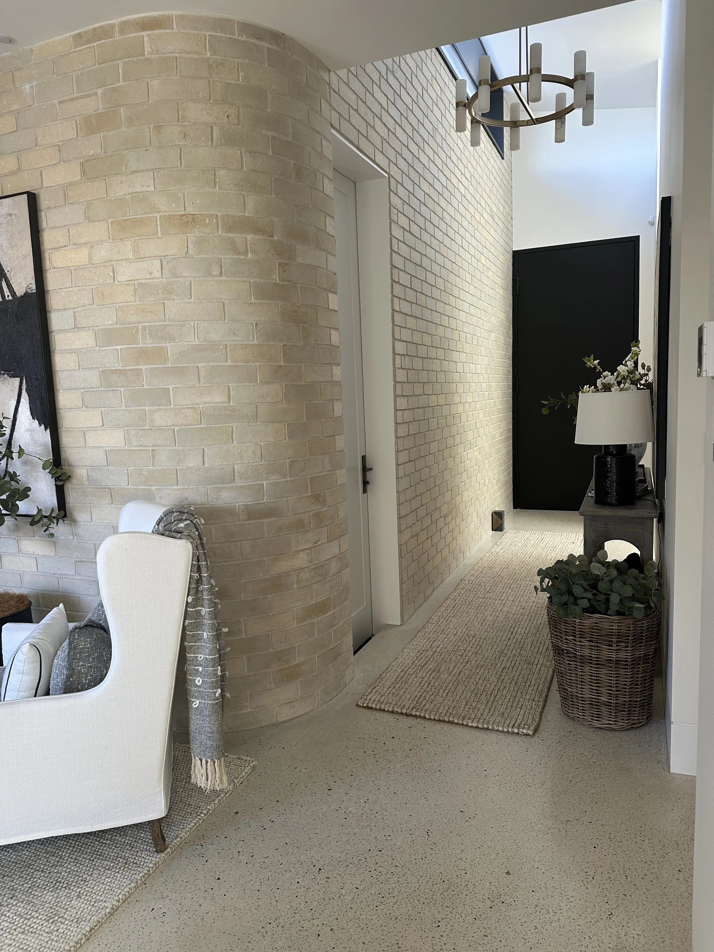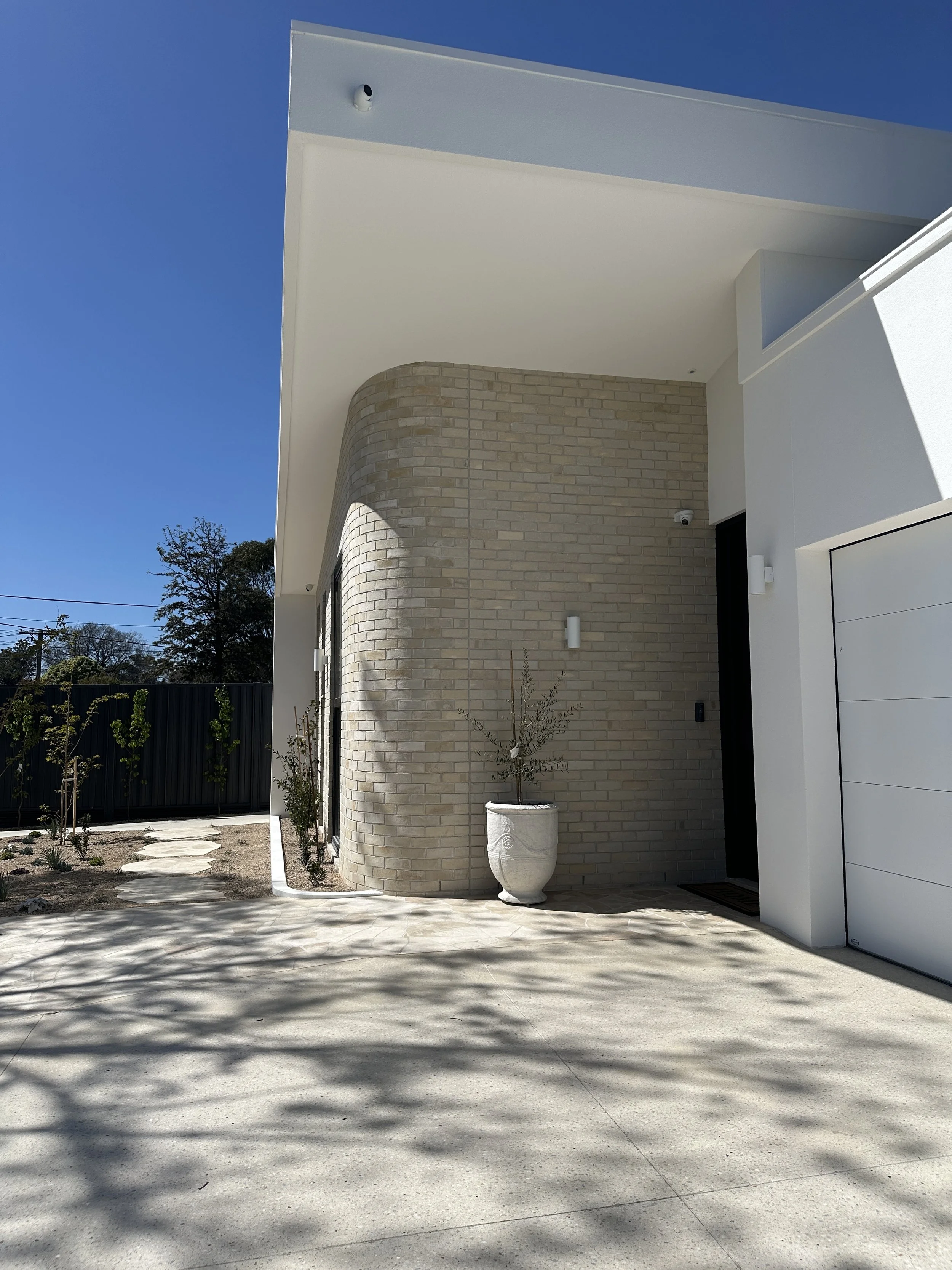 This home features both external and internal curved brickwork, seamlessly tying the façade to the interior. Soft, natural tones, travertine paving, and walnut joinery create a cohesive and refined palette that feels modern yet inviting. Every detail — from the skylit kitchen to the curved fireplace and resort-style pool — was designed to celebrate craftsmanship and flow.